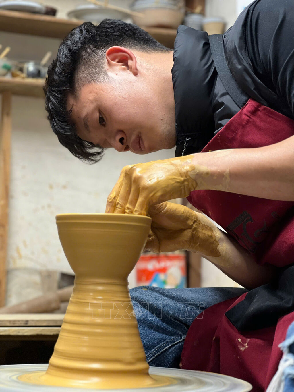 | L'artisan-peintre Bùi Văn Huân façonne un vase sur son tour de potier. |