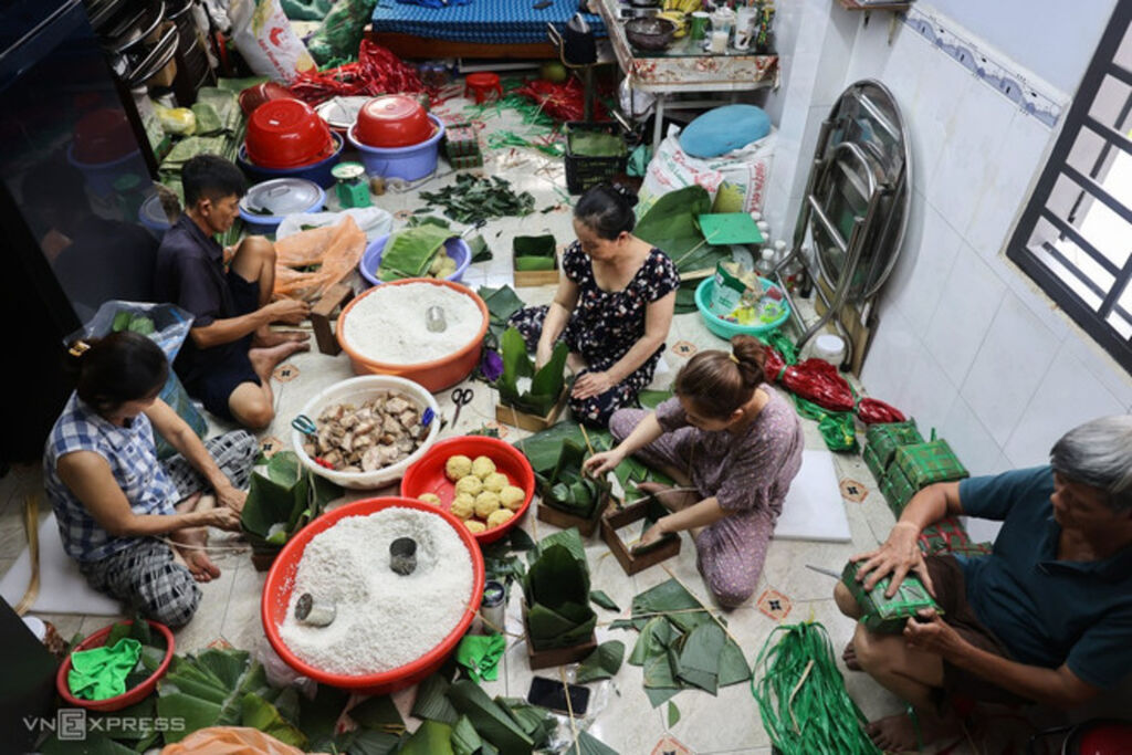 Le plat le plus typique du Têt vietnamien est sans doute le banh chung, un gâteau de riz gluant de forme carrée. Le processus de fabrication du banh chung est une opportunité pour la famille de se réunir.