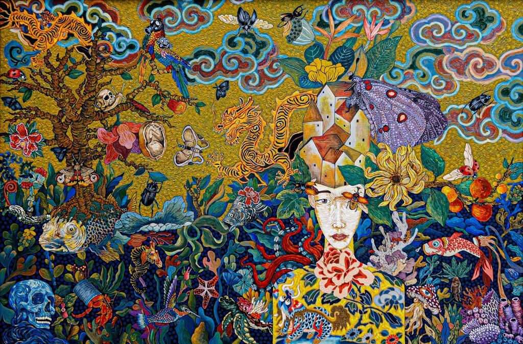 Depuis qu’elle s’est lancée dans la peinture, elle n’a eu de cesse d’enrichir son univers coloré grâce à différentes techniques picturales. Chacune de ses œuvres révèle en effet des combinaisons audacieuses : entre perspective 2D et détails en relief 3D, entre images du quotidien et un monde imaginaire empreint de magie, entre la touche picturale et les techniques complexes de la mode telles que la broderie ou le perlage.