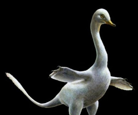 Plus étrange : ce petit dinosaure d'un mètre vingt environ possédait aussi certaines caractéristiques de prédateurs aquatiques : des dents et un museau de crocodile et un très long cou ressemblant à celui du cygne.