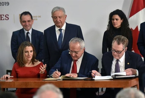 | La vice-présidente du Canada Chrystia Freeland, le représentant américain au commerce, Robert Lighthizer (droite), et le négociateur commercial en chef du Mexique pour l'Amérique du Nord, Jesus Seade, signent un accord de libre-échange, le 10 décembre 2019 à Mexico. |