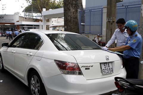 | Un policier arrête un chauffeur d'Uber faute d’autorisation de services de transport à Hô Chi Minh-Ville, le 6 février 2015. |