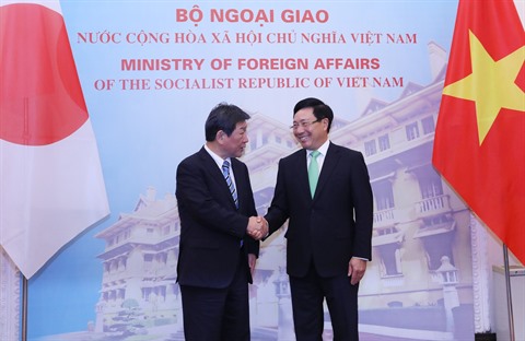 | Le vice-Premier ministre et ministre des Affaires étrangères, Pham Binh Minh (droite) et le ministre japonais des Affaires étrangères, Motegi Toshimitsu, le 6 janvier à Hano |
