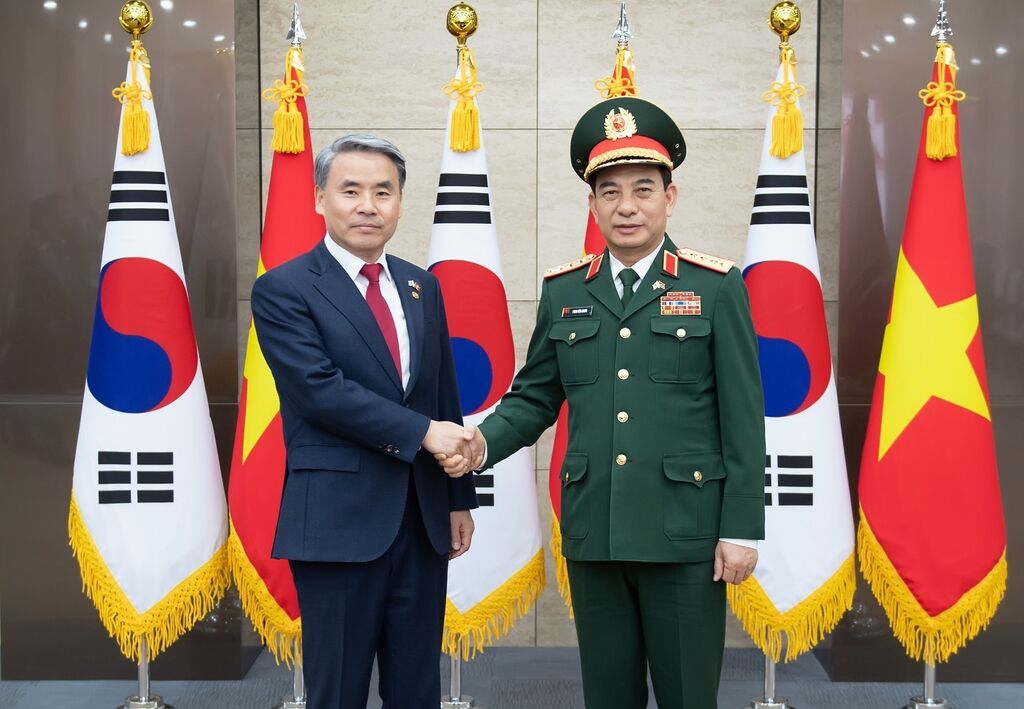 | Le ministre vietnamien de la Défense, Phan Van Giang (droite), et son homologue sud-coréen, Lee Jong-sup. |