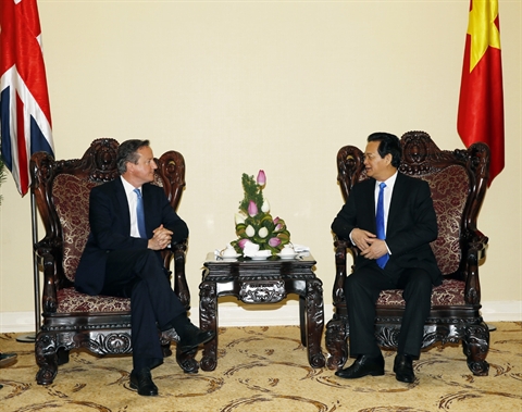Le Premier ministre Nguyên Tân Dung a félicité chaleureusement son homologue britannique d'effectuer une visite officielle au Vietnam juste au moment où les deux pays célèbrent les cinq ans de l’établissement de leur partenariat stratégique. Il a affirmé que le Vietnam prenait toujours en haute considération le renforcement des relations d’amitié et de coopération avec le Royaume-Uni, et s’est déclaré convaincu que cette visite donnerait une forte impulsion à la coopération bilatérale.