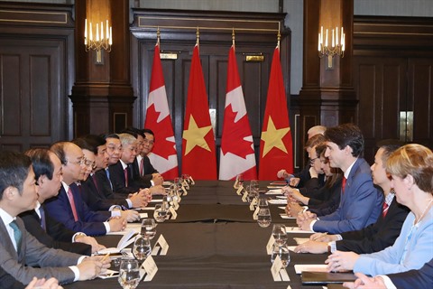 | Vue générale de l'entretien entre le Premier ministre vietnamien Nguyên Xuân Phuc et son homologue canadien Justin Trudeau le 10 juin à Québec. |