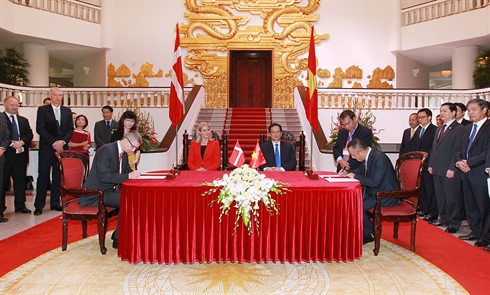 | Signature de l'accord de coopération entre SEMCO et Petro Vietnam, en présence de la Première ministre danoise Helle Thorning-Schmidt et son homologue vietnamien Nguyên Tân Dung |