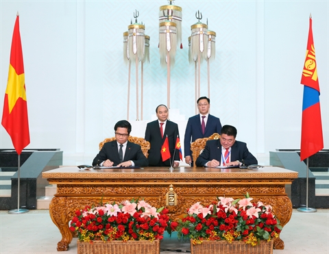 | Le PM Nguyên Xuân Phuc (gauche) et son homologue mongol Jargaltulga Erdenebat, le 13 juillet en Mongolie. |