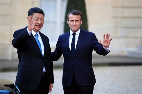| Emmanuel Macron et Xi Jinping, le 25 mars 2019, dans la cour de l'Élysée. |