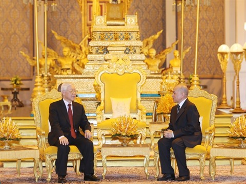 | Le secrétaire général du PCV et président vietnamien Nguyên Phu Trong (gauche) et le roi Norodom Sihamoni. |