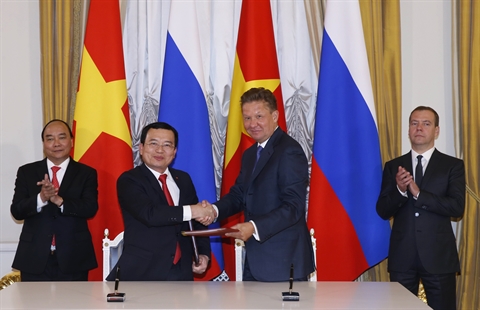| Cérémonie de signature entre le groupe gazo-pétrolier national du Vietnam et celui russe Gazprom, en présence des Premiers ministres Nguyên Xuân Phuc et Dmitry Medvedev, le 16 mai à Moscou. |