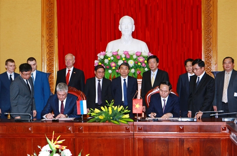 | Trân Dai Quang (droite) et Kolokoltsev Vladimir Aleksanndrovitch signent, le 21 mars à Hanoi, un programme d'action pour la période 2016-2018. |