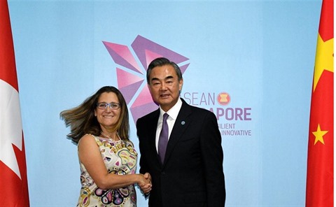 | Le conseiller d'État chinois et ministre des Affaires étrangères Wang Yi et son homologue canadienne Chrystia Freeland au Singapour le 3 août. |
