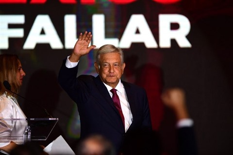 | Le président élu mexicain, Andrés Manuel Lopez Obrador salue ses soutiens à Mexico, le 1er juillet. |