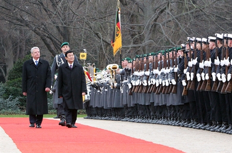 | Le président du Vietnam, Truong Tân Sang, et son homologue allemand Joachim Gauck inspectent la garde d'honneur, le 25 novembre à Berlin. |
