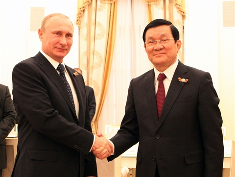 | Le président du Vietnam,Truong Tân Sang (droite), et son homologue russe, Vladimir Poutine, le 9 mai en Russie. |