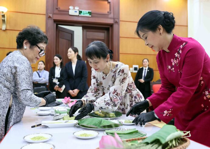 >> Les épouses de dirigeants vietnamien et japonais préparent du "bánh cốm"