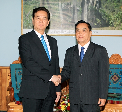 | Le Premier ministre Nguyên Tân Dung (gauche) et son homologue lao Thongsing Thammavong, le 15 mars dans la province de Houaphan |