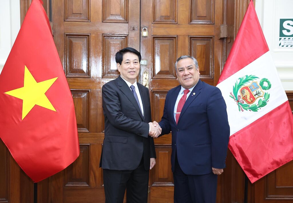 | Le président vietnamien Luong Cuong (gauche) et le président du Conseil des ministres du Pérou, Gustavo Adriazén. |