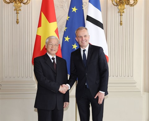 | Le secrétaire général du Parti communiste du Vietnam Nguyên Phu Trong (gauche) et le président de l'Assemblée nationale française, François De Rugy, le 26 mars en France. |