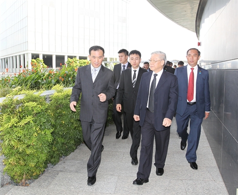 | Le secrétaire général Nguyên Phu Trong (1er plan, au milieu) visite le centre des hautes technologies Fusionopolis. |
