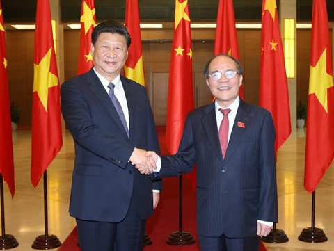 | Le président de l'AN vietnamienne, Nguyên Sinh Hùng (droite), et le secrétaire général du PCC et président chinois, Xi Jinping, le 6 novembre à Hanoi. |