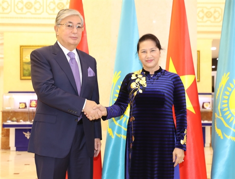 | La présidente de l’Assemblée nationale du Vietnam, Nguyên Thi Kim Ngân, et le président du Sénat kazakh Kassym Zhomart Tokayev, le 17 octobre à Astana. |