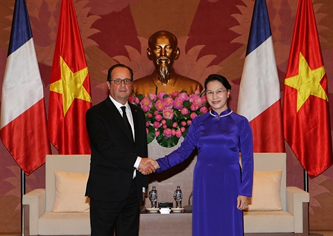 | La présidente de l'Assemblée nationale Nguyên Thi Kim Ngân et le président français François Hollande, le 6 septembre à Hanoï. |