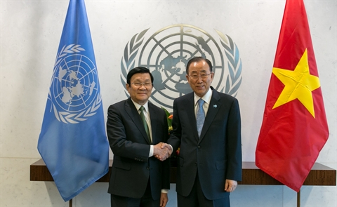 | Le président du Vietnam Truong Tân Sang (gauche) et le secrétaire général de l'ONU, Ban Ki-moon. |
