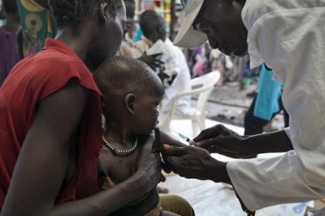 | Un enfant déplacé par les combats au Soudan du Sud se fait vacciner, dans un camp de réfugiés de Gambella, en Ethiopie, le 10 juillet 2014. |