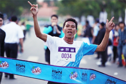 | Le coureur Nguyên Dang Duc Bao a gagné le premier prix de la course de 10 km en professionnel de la HCMC Run 2015. |