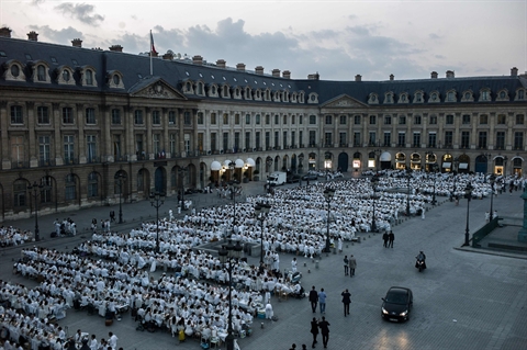 Tous cooptés, "amis d'amis", les participants du 28e "Dîner en blanc", tous vêtus de blanc et venus avec tables, chaises, argenteries, vins fins et victuailles, ont rejoint la Place Vendôme au terme d'un jeu de piste, découvrant au dernier moment le site final.