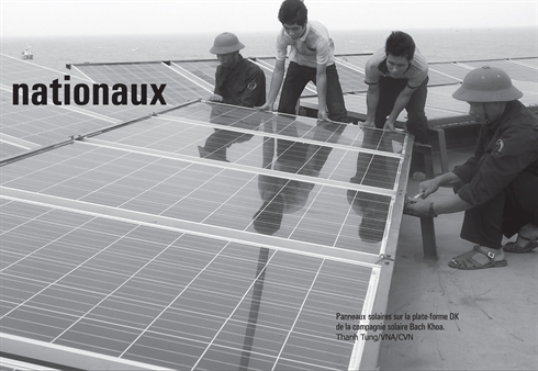 | Panneaux solaires sur la plate-forme DK de la compagnie solaire Bach Khoa. Éoliennes sur l’île de Song Tu Tây (archipel de Truong Sa). |