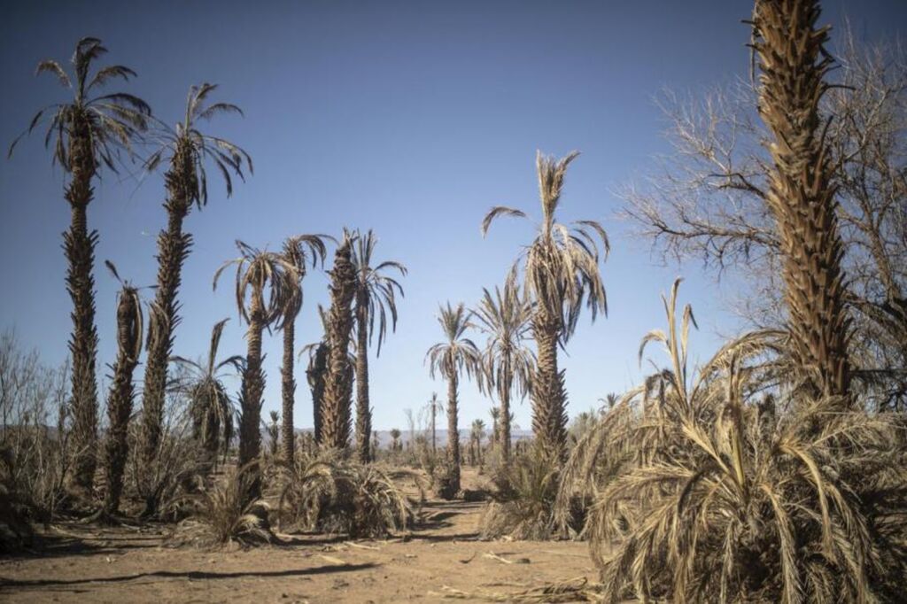 | Des palmiers morts à cause de la sécheresse dans la ville de Nkob, près de Zagora au Maroc, en novembre 2022. |