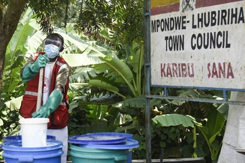 | Un agent sanitaire prépare une solution de chlorine pour désinfecter au centre de santé de Mpondwe, le 13 juin en Ouganda. |