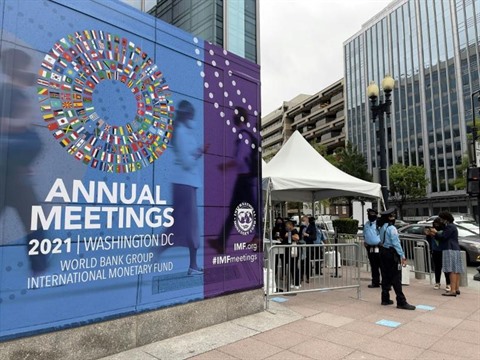 | Devant le siège du Fonds monétaire international à Washington, le 11 octobre 2021, à l'occasion des réunions annuelles du FMI et de la Banque mondiale. |