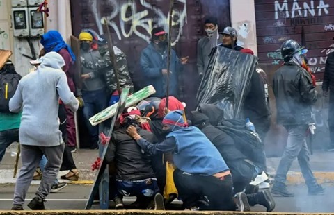 | Heurts entre manifestants indigènes et policiers à Quito, le 23 juin en Équateur. |