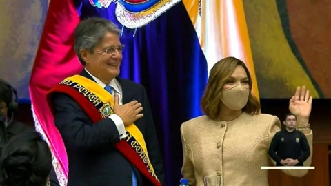 | Le nouveau président équatorien Guillermo Lasso lors de son investiture au Parlement unicaméral de Quito, le 24 mai. |