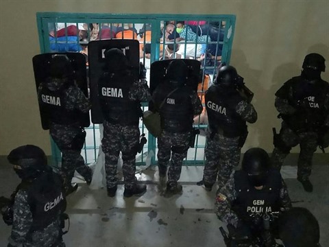 | Photo diffusée par la police équatorienne le 30 septembre de policiers intervenant à la prison de Guayaquil, en proie à des affrontements entre prisonniers. |