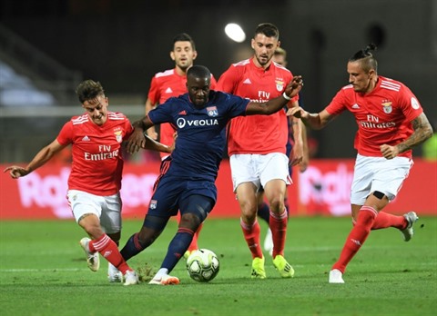 | Le milieu de Lyon, Tanguy Ndombélé (centre), à la lutte avec le défenseur de Benfica, Franco Cervi, en amical, le 1er août à Faro. |