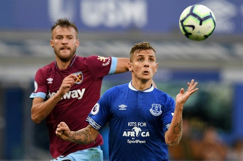 | Le défenseur d'Everton, Lucas Digne (droite), contrôle le ballon face à l'attaquant de West Ham Andriy Yarmolenko, le 16 septembre à Liverpool. |