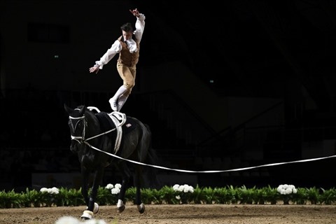 | Le Français Clément Taillez exécute son numéro de voltige pour la Coupe du monde à l'Ecole Nationale d'Equitation de Saumur, le 18 avril. |