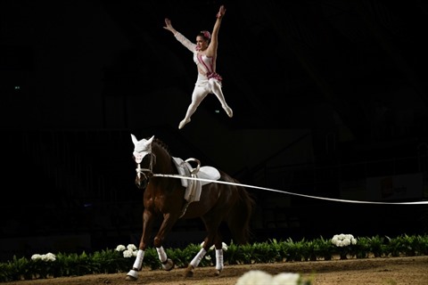 À Saumur, ce week-end, la voltige sort le grand jeu pour la finale de la Coupe du monde. Des hommes, des femmes, des tandems (qui peuvent être mixtes) qui s'affrontent en musique et en costumes de scène, entre salto arrière et "à-terre" (quand le voltigeur tape ses pieds au sol avant de remonter) sur des chevaux sans selle mais équipés de surfaix (pièce de harnais) et tapis.