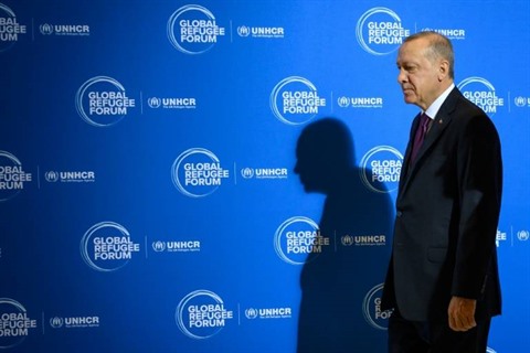 | Le président turc Recep Tayyip Erdogan à l'ouverture du Forum mondial sur les réfugiés, le 17 décembre à Genève. |
