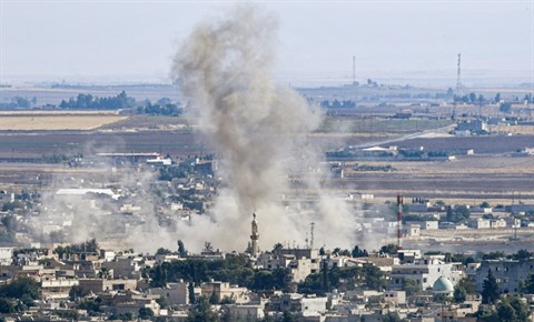 | Photo prise le 15 octobre depuis la ville turque de Ceylanpinar, montrant de la fumée s'élever au dessus de la ville syrienne de Ras al-Aïn. |