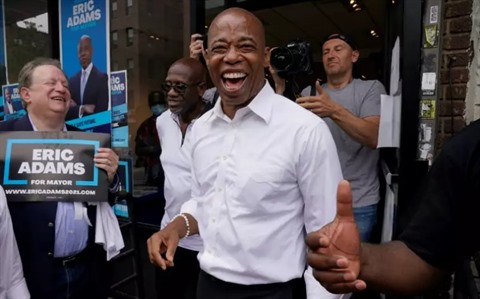 | Le candidat démocrate Eric Adams donné gagnant pour la mairie de New York, durant un événement de campagne à Brooklyn le 21 juin. |