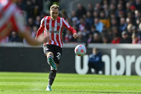 | Christian Eriksen tire un coup franc pour Brentford en championnat contre Burnley à Londres, le 12 mars. |