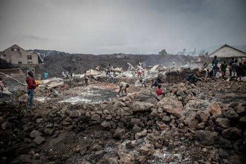 | Des habitants de Goma découvrent les dégâts provoqués par une coulée de lave du volcan Nyiragongo, le 23 mai en RDC. |