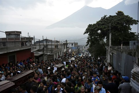 | Les cercueils de sept des victimes de l'éruption du volcan de feu sont transportés par les habitants à Alorenango, au Guatemala, le 4 juin. |