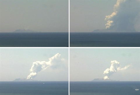 | Montage d'images d'une webcam montrant l'éruption du volcan de White Island, le 9 décembre en Nouvelle-Zélande. |